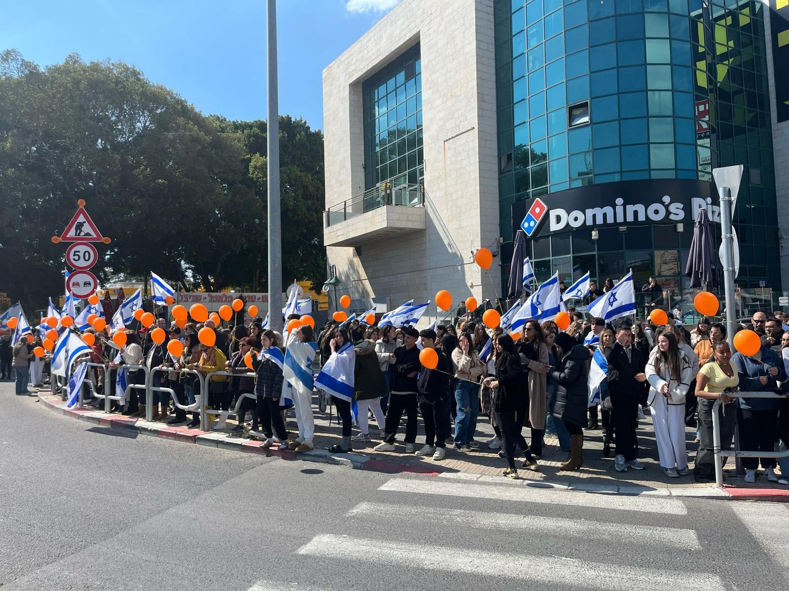 בהמשך יצאנו תלמידים, מורים, עובדים וכתת הותיקים, כאות הזדהות ובמחווה של סולידריות, מלווים בדגלי ישראל ובלונים כתומים, לככר המשטרה, עמדנו בצידי הדרך ושרנו יחד את התקווה.