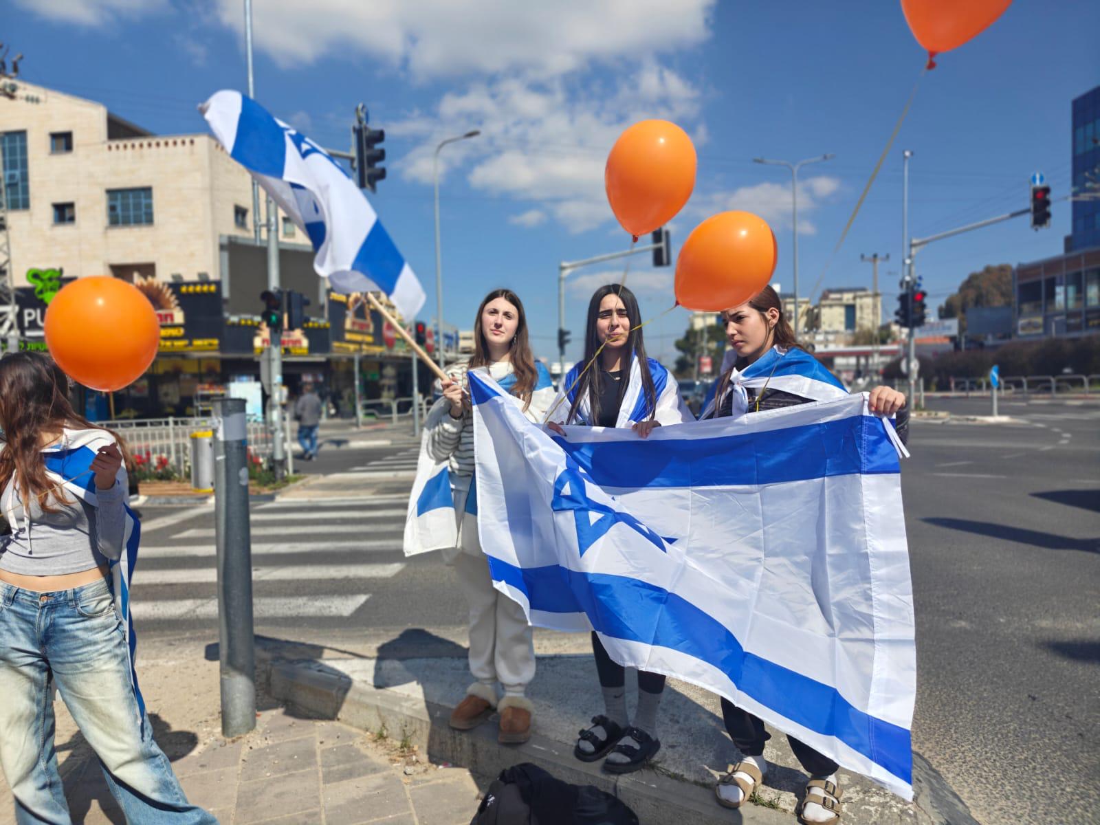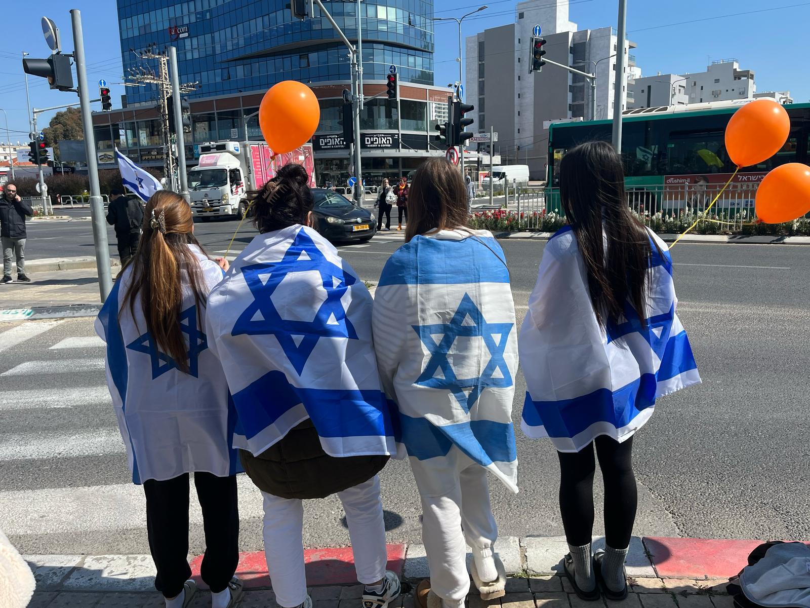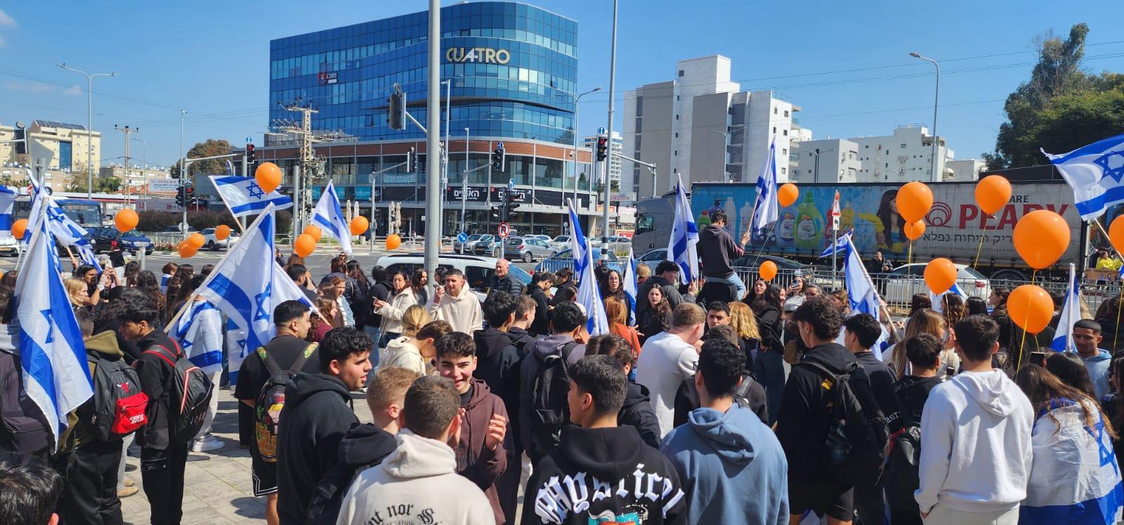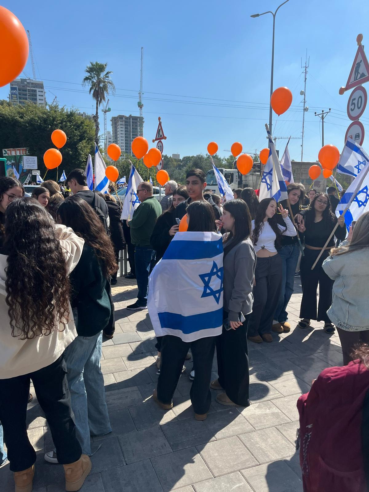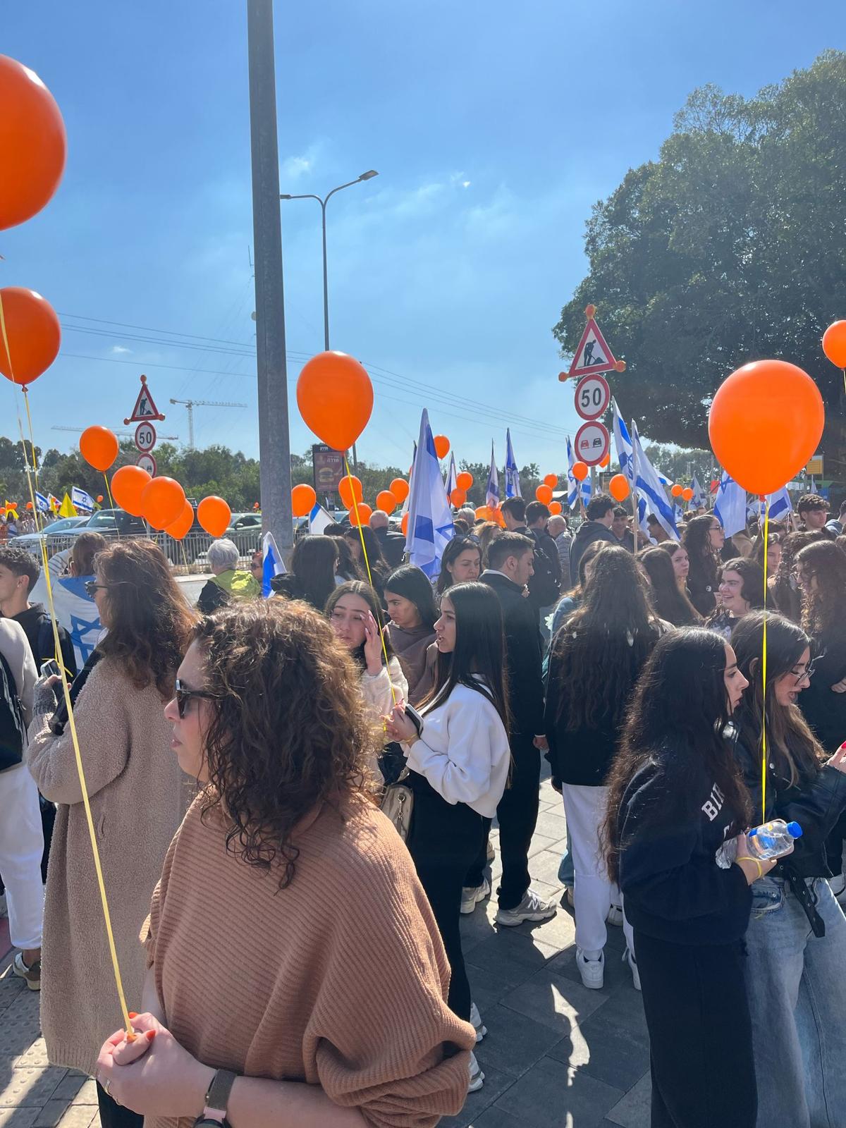 בהמשך יצאנו תלמידים, מורים, עובדים וכתת הותיקים, כאות הזדהות ובמחווה של סולידריות, מלווים בדגלי ישראל ובלונים כתומים, לככר המשטרה, עמדנו בצידי הדרך ושרנו יחד את התקווה.